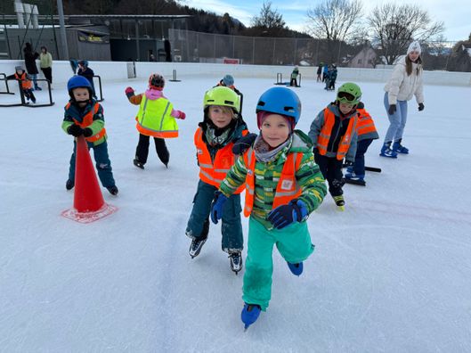 Mit dem Bus machten sich die Kinder und Pädagoginnen gemeinsam vom Kindergarten Meiningen aus auf den Weg. Schon im Bus ergaben sich viele Gespräche und die Vorfreude stieg immer weiter. Nach der Ankunft stärkten sich alle zuerst bei einer gemeinsamen Jause, bevor es gut vorbereitet und voller Motivation auf das Eis ging. Zwischendurch sorgten warmer Tee und Kekse für eine kleine Stärkung, damit die Kinder mit neuer Energie weiterfahren konnten. Die Kinder zeigten große Ausdauer, gegenseitige Rücksichtnahme und immer mehr Sicherheit auf dem rutschigen Eis.